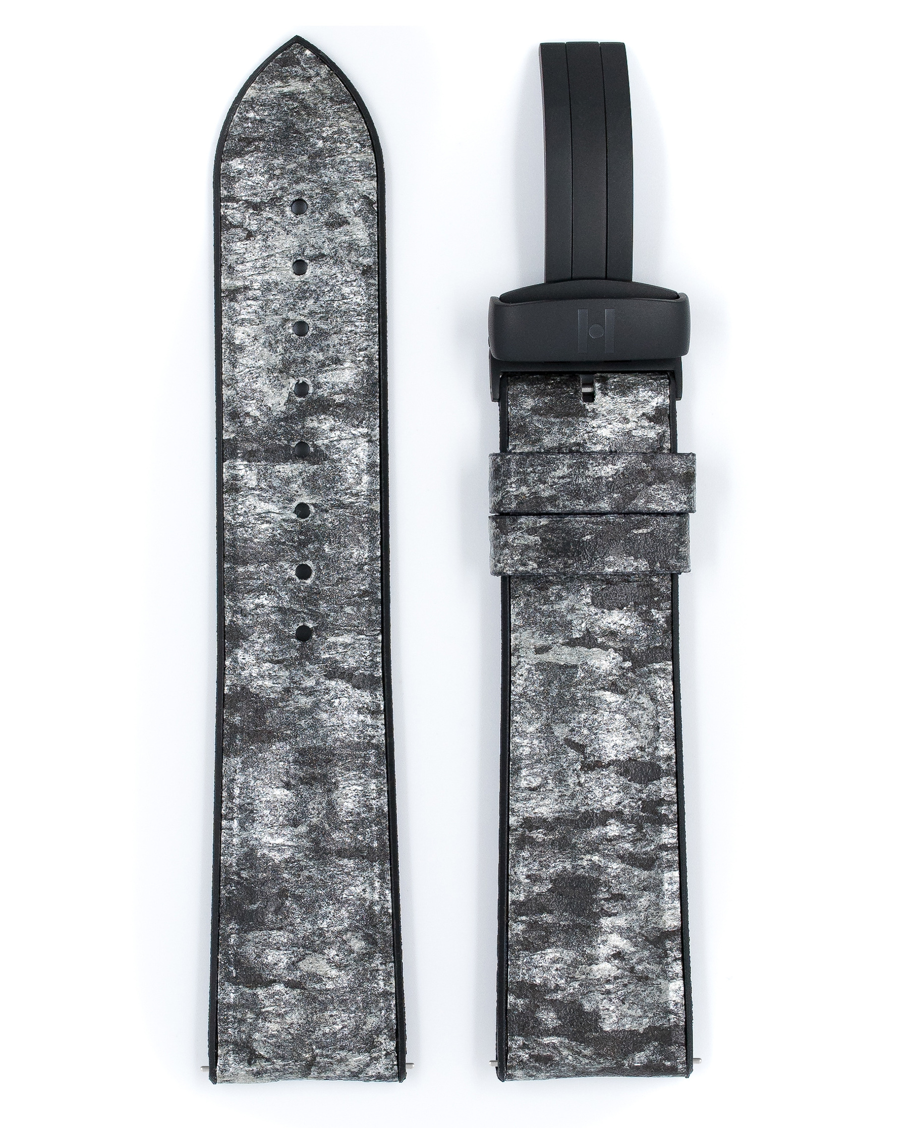 Ремешок Hirsch 20/18, особенностью ремешка является то, что его наружный слой изготовлен из камня, специальным образом обработанный сланец, толщиной не более волоса соединяется в этом ремне с анатомической каучуковой подкладкой, обеспечивающей комфортное ношение, ремень снабжен матовой черной раскладной застежкой, длина 120/80, коллекция Performance Stone