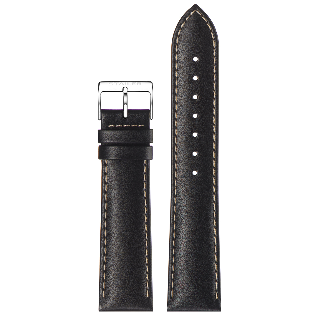 Ремешок Stailer 22/20, натуральная кожа, чёрный, белая прострочка, длина 115/75, коллекция Original