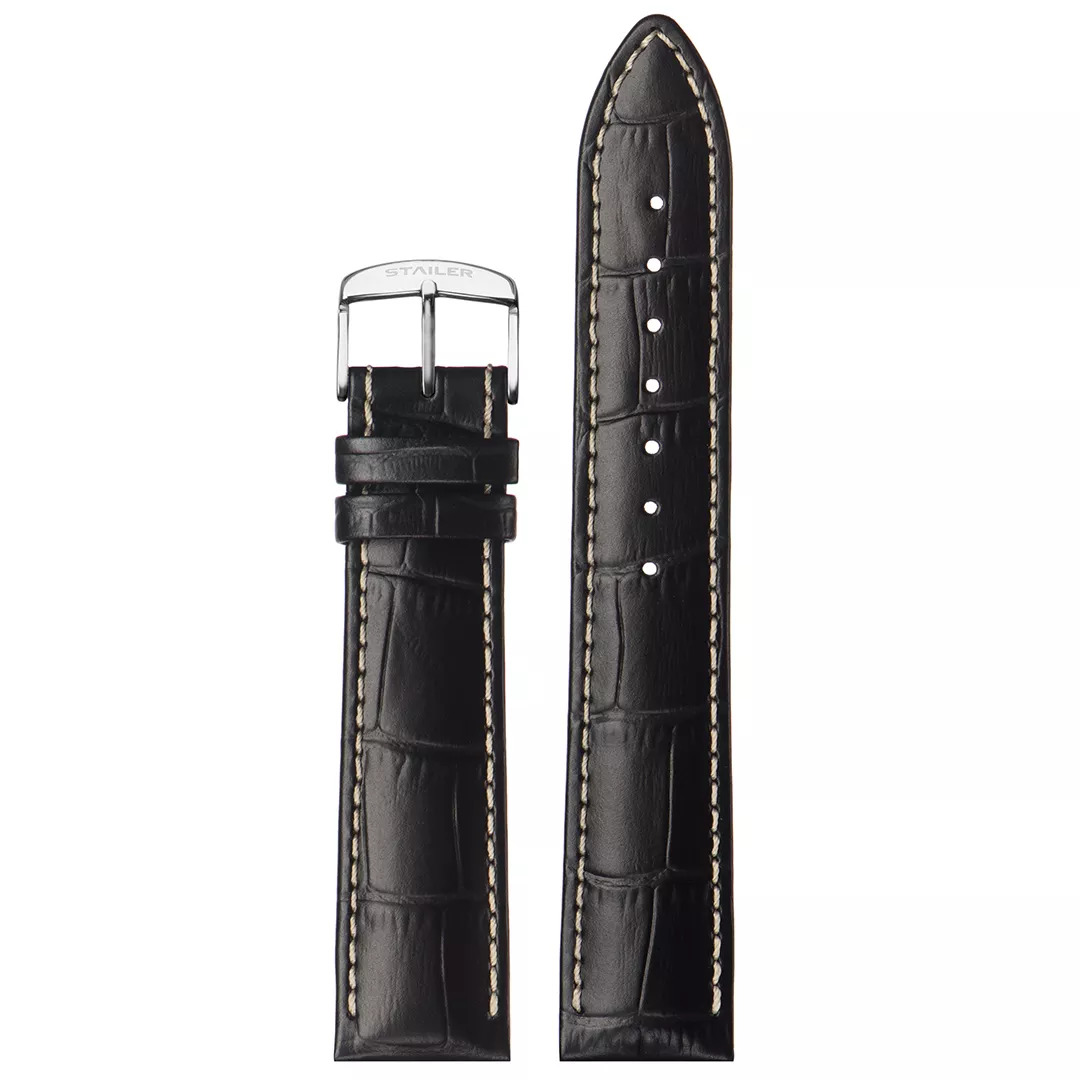 Ремешок Stailer 22/20, верхний слой ремня выполнен из натуральной кожи с тиснением под аллигатора, черный, белая прострочка, подкладка из натуральной кожи Anfibio цвета Beige обладает особой мягкостью и износостойкостью, длина 120/80, коллекция Premium Chrono Stailer Premium Chrono