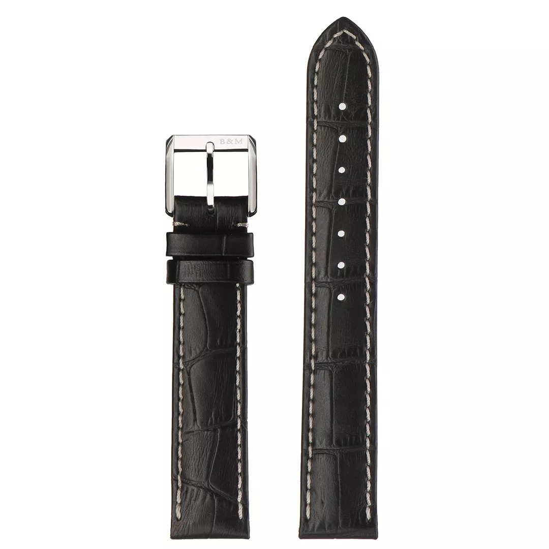 Ремешок Stailer 17/16, натуральная кожа с тиснением под аллигатора, черный, белая прострочка, длина 115/75, коллекция B&M