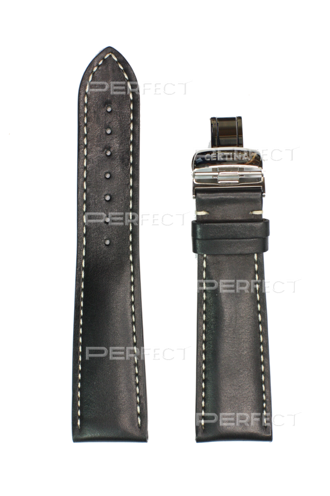 Ремешок Certina 24/20, натуральная кожа, белая прострочка, чёрный, стальная клипса, длина 125/80